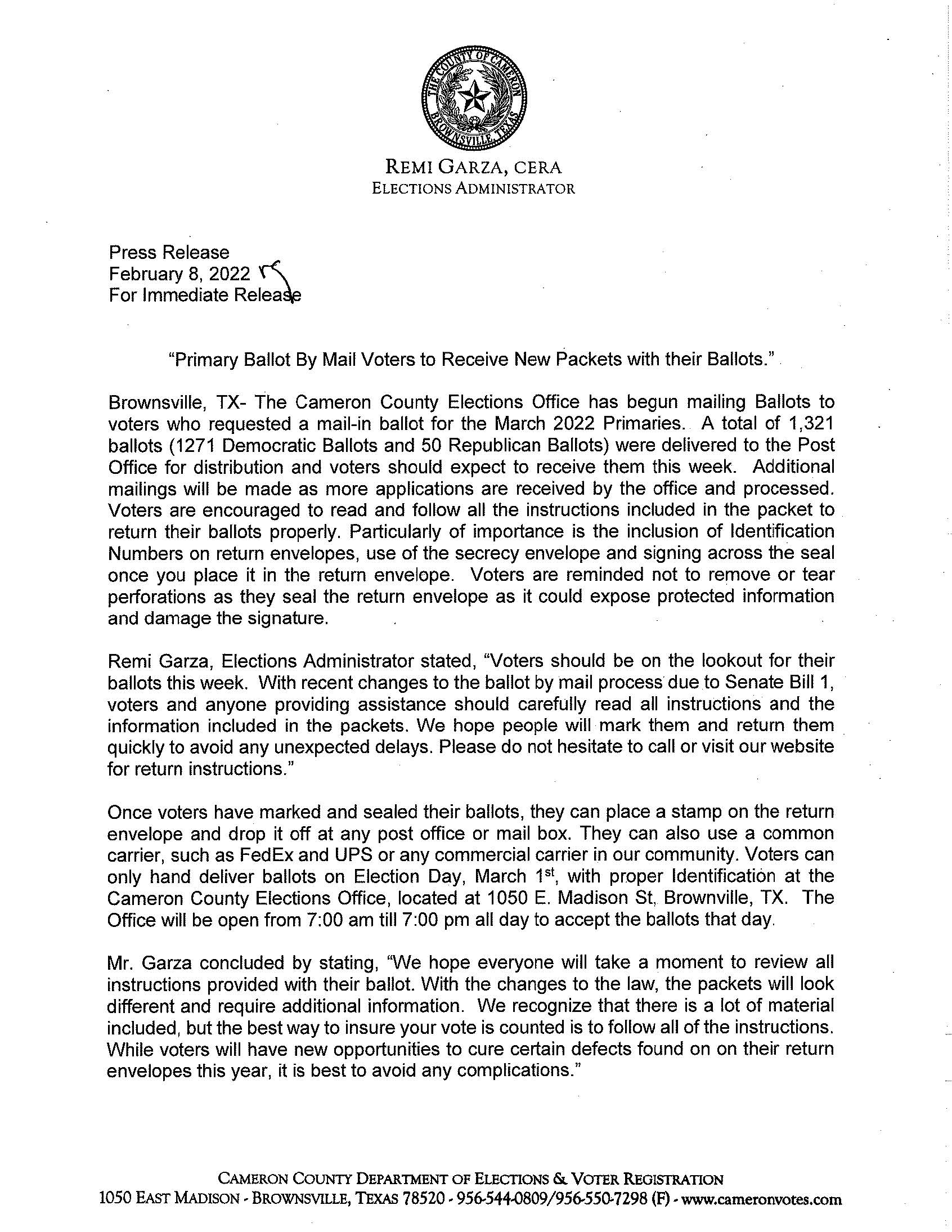 Cameron County Voter Registration Figures - Texas Cameron County Voter Registration Figures Skip to Main Content Election Outlook: More about Identification Requirements for Voting | Early voting for the March 1, 2022 Primary Election Date runs Monday, February 14, 2022 - Friday, February 25, 2022 | Last day to apply for ballot by mail (received, not postmarked) is Friday, February 18, 2022 ...