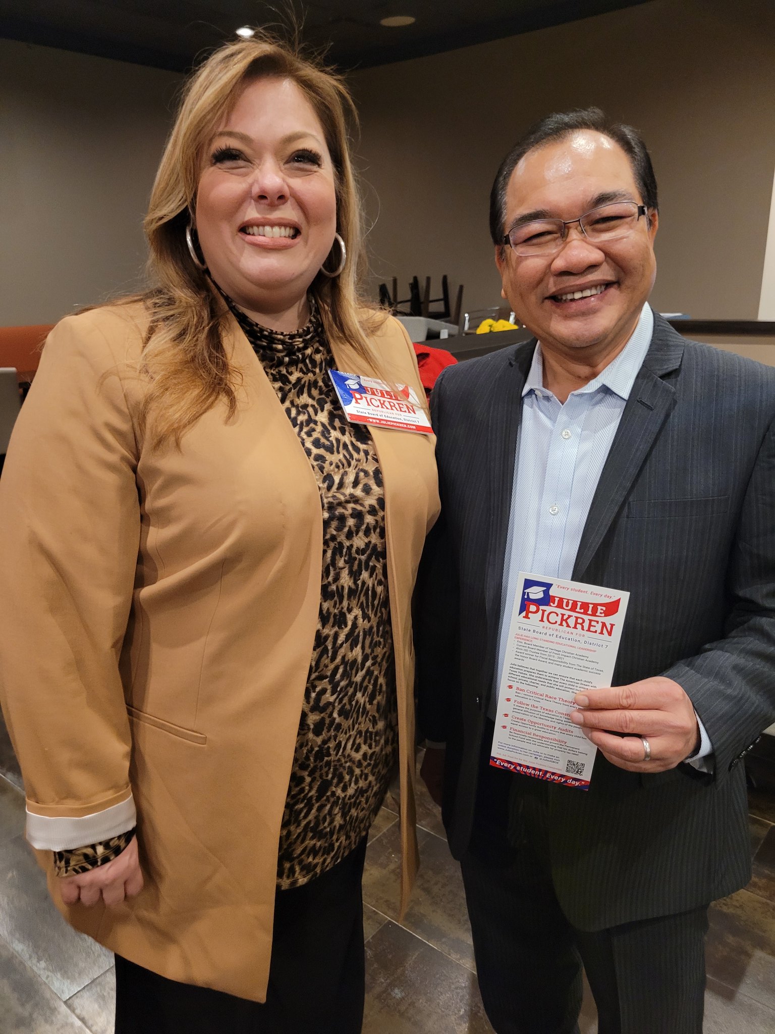 Candidate Profile | iVoterGuide.com Julie Pickren Party Republican Race State Bd. of Educ., Dist. 7 Incumbent No Links Panel Rating Conservative Endorsements Conservatives 15 Ann Hettinger, Briscoe Cain, Bryan Hughes, David Bradley, Jacey Jetton, Mayes Middleton and 9 more Others 3 Bangar Reddy, Dan Matthews, Dave Rosenthal Reported by Candidate 10
